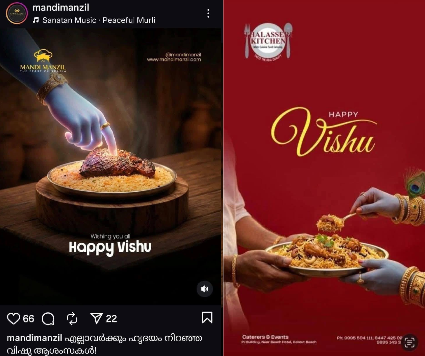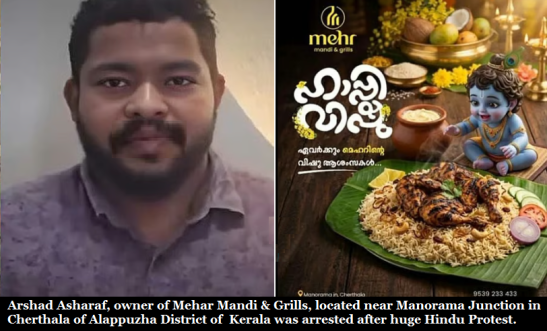 In the Cherthala case, a restaurant owner identified as Arshad Asrafi, proprietor of Mehar Mandi & Grills near Manorama Junction, was arrested after a Vishu greeting poster showing Lord Krishna seated before a plate of chicken mandi sparked protests by Hindu organisations. A complaint filed by advocate M.V. Biju alleged that the depiction was offensive to religious sentiments.