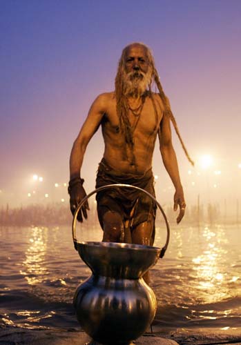 Allahabad, INDIA: An Indian sadhu (Hindu holy man) takes a bath at Sangam, the confluence of the Ganges, Yamuna and Saraswati rivers in Allahabad, early 16 January 2007, during the Ardh Kumbh Mela festival (Half Pitcher festival). Hundreds and thousands of devotees and Hindu holy men are taking part in the largest religious congregation of the world on the banks of Sangam, the confluence of the rivers Ganges, Yamuna and the mythical Saraswati, during the Ardh Kumb Mela (fair) which lasts 45 days and commemorates a mythical battle between gods and demons over a pitcher of the nectar of immortality. AFP PHOTO/ MANAN VATSYAYANA (Photo credit should read MANAN VATSYAYANA/AFP/Getty Images)